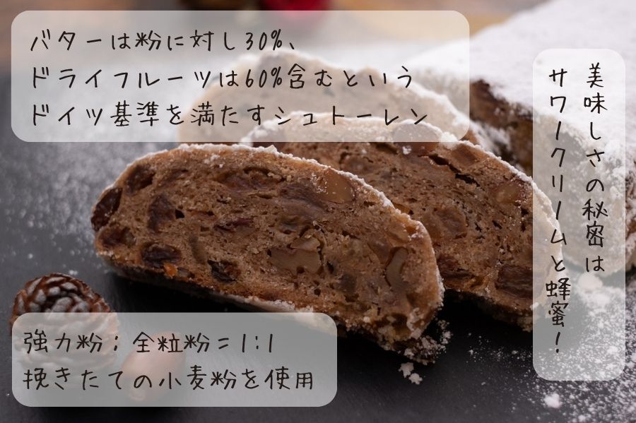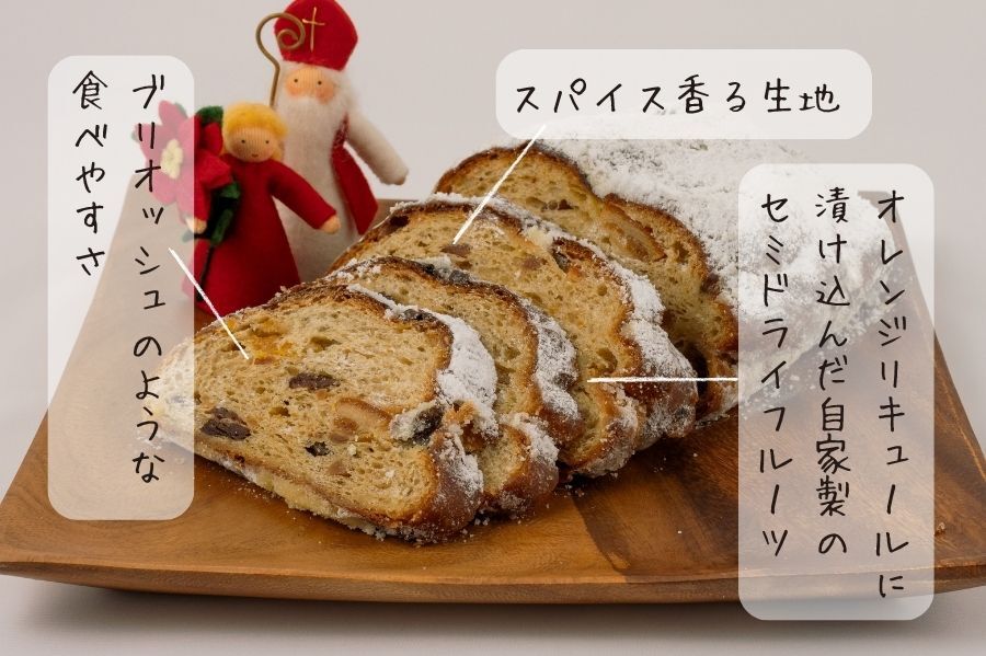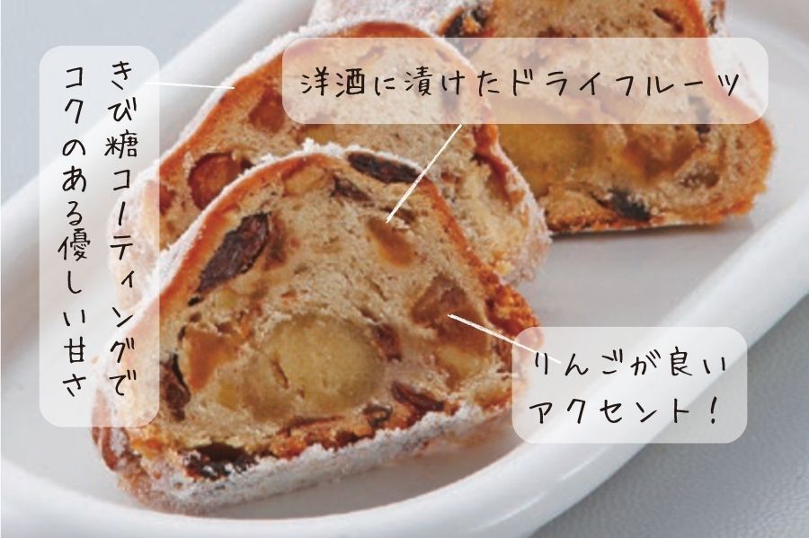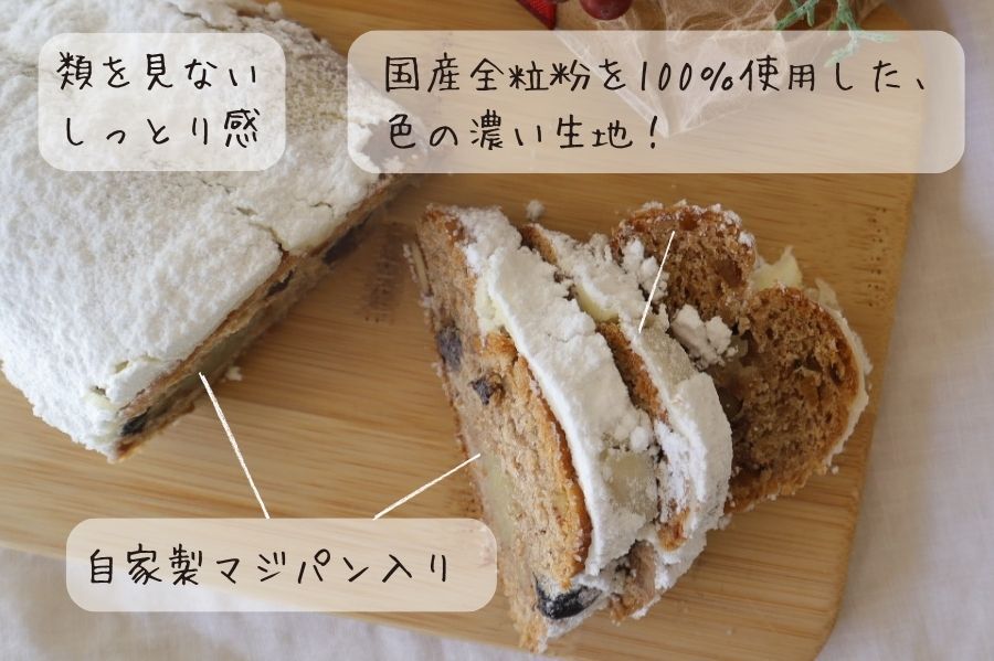 - 「定番シュトーレンを基本にオリジナリティを出すために、他ではあまり使われないドライリンゴを使いリンゴの風味をプラス。