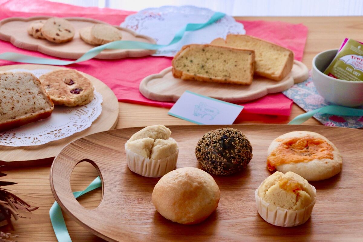 パン・蒸しパン・ケーキ・クッキー・紅茶等が入る、アフタヌーンティーセット。なんと、完全グルテンフリーです。