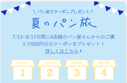 期間中に異なる4つのお店でパンを購入いただいた方に、もれなく600円分のクーポンをお届けします。
