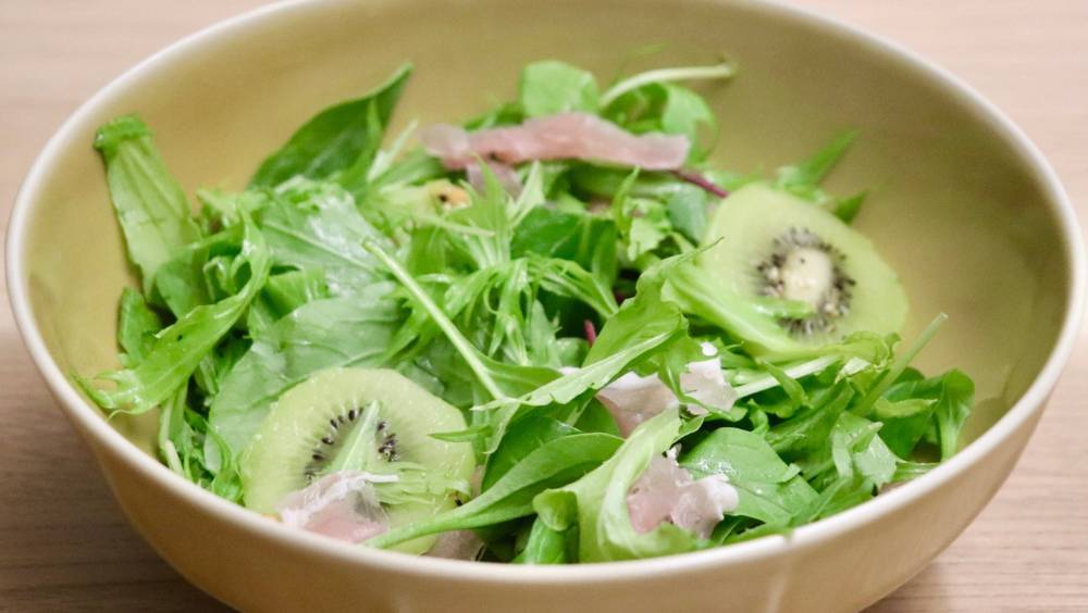 キウイの酸味と生ハムの塩味がマッチして、華やかでかわいいサラダがあっという間に完成します。