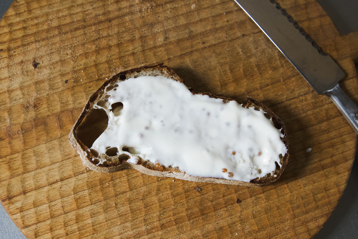 ③ マスタード、マヨ+ヨーグルト混ぜ合わせたソースを塗る