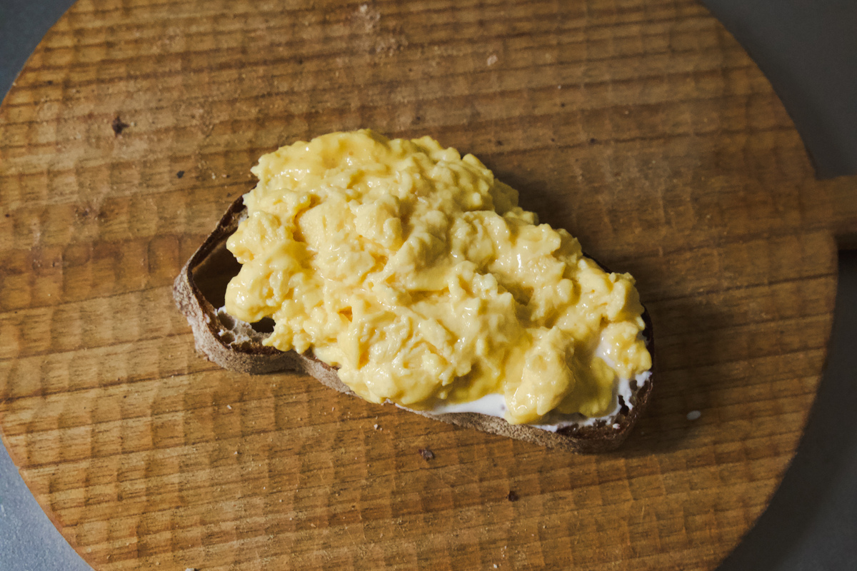 ① 卵・牛乳・砂糖を混ぜて、弱火でふんわりスクランブルエッグに。火を入れすぎないのがポイント◎