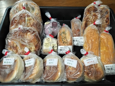 受け取ったのが宅急便60sizeの箱だったので少ないのかと思ったら次々に出てきてワクワクしました。惣菜パン14個の他に、お店の看板商品米粉パン2個をサービスで入れてくださいました。