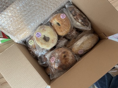 丁寧な梱包と、全て味の違う12個のベーグルが届きました。解凍の仕方通りにリベイクし、オーブンで焼いて食べたら、もっちりパリでした。