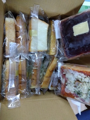 小ぶりなパンですが、惣菜パンや菓子パンが箱にビッシリ詰め込まれ、1つ1つのパンに名前シールが貼ってあり、同梱の一覧表を見るとどんなパンなのかわかるようになっています。