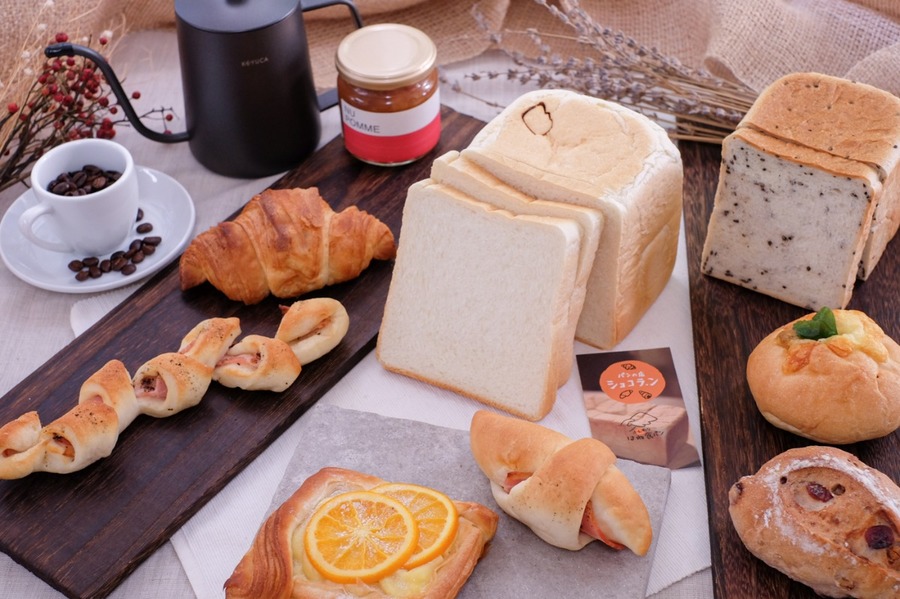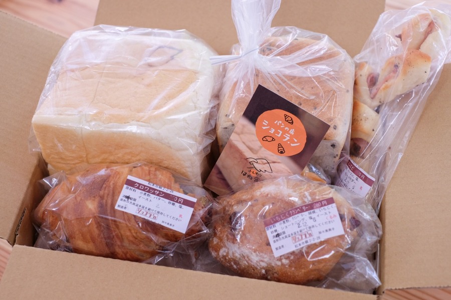 ●ショコラ.ンこだわりのはね食パン1斤 ●その他季節のパンを5〜7種類 ●焼菓子またはラスク(または季節のパン)の おまけ付き♪