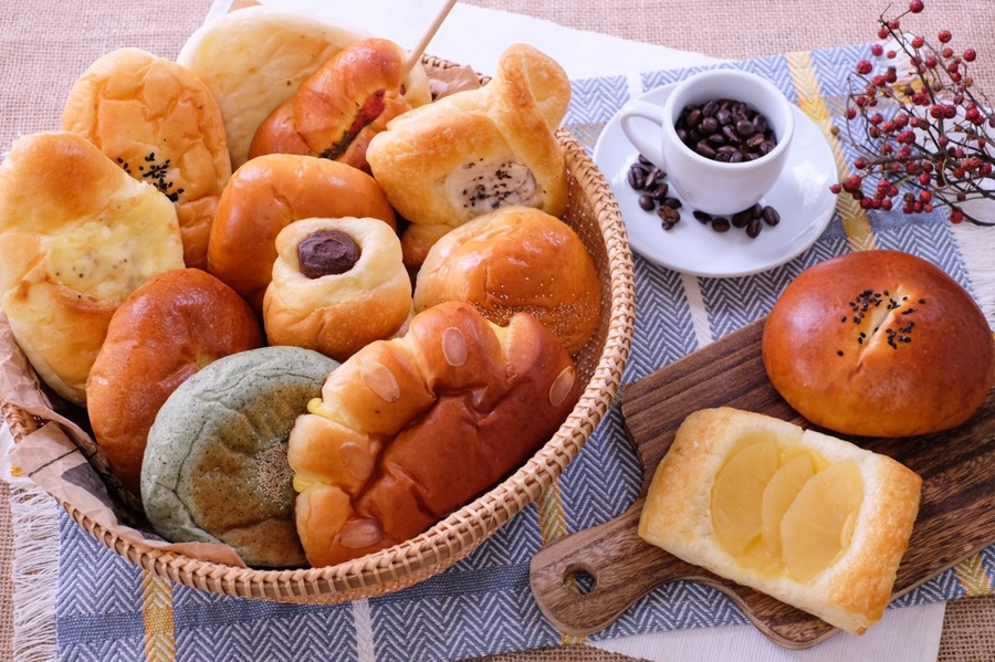 小麦粉・砂糖・卵・牛乳・バター・ショートニング・イースト・脱脂粉乳・塩・黒ゴマ・あんこ・チーズ・りんご・さつまいも・ウインナー 他 ※アレルギーがご心配な方はご遠慮下さい。 ※各パンに原材料表示シールを貼付します。 小倉あんパン(商品一例):つぶあん(国内製造)、煮豆(小豆)、砂糖、還元水飴、小麦粉、砂糖、卵、牛乳、バター、ショートニング、イースト、脱脂粉乳、食塩、黒ゴマ/乳化剤、酸化防止剤(ビタミンE)(一部に小麦、卵、乳成分を含む)
