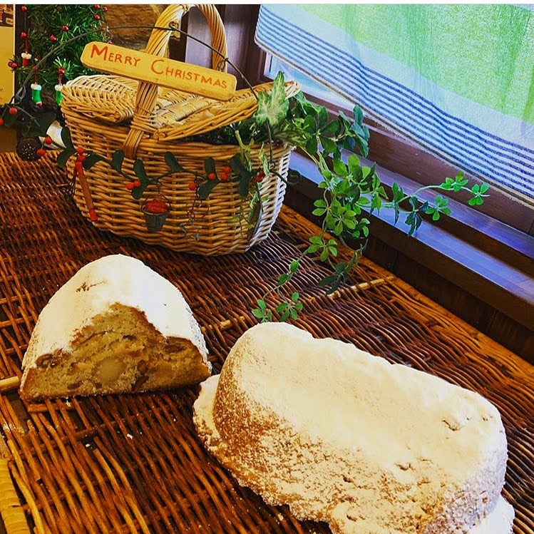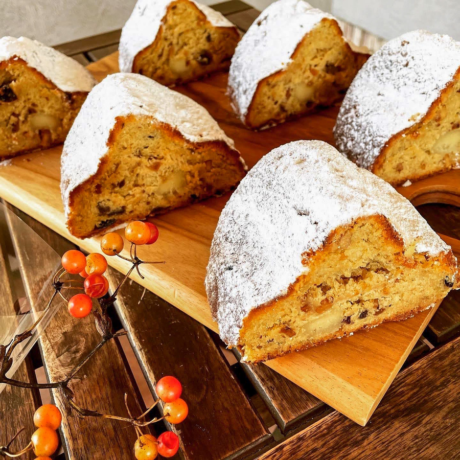 小麦粉(国内製造)バター、アーモンド、洋酒、砂糖、卵黄、くるみ、山形県産レーズン、オレンジピール、レモンピール、りんご、イースト、塩 (一部に小麦、乳成分、卵、オレンジ、大豆、アーモンド、りんごを含む) ※アレルギーが心配な方はご遠慮ください。