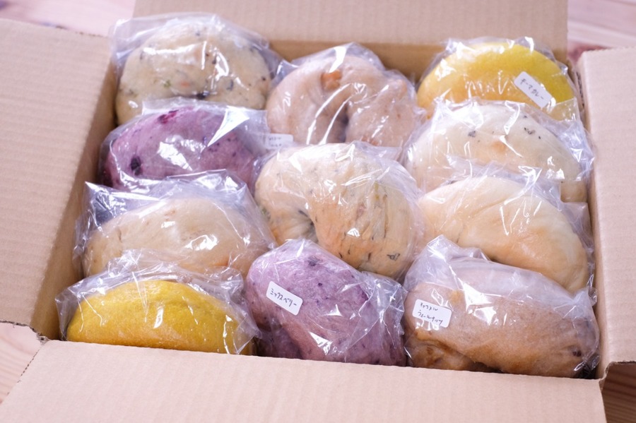 60サイズの箱に12個前後のベーグルを詰めてお送りします。