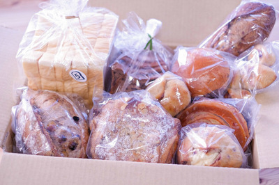 12~15個ほど入ります。 4,000円相当分を80サイズ(外寸70cm)の箱に詰めてお送りします。 ※パンの大きさにより前後します