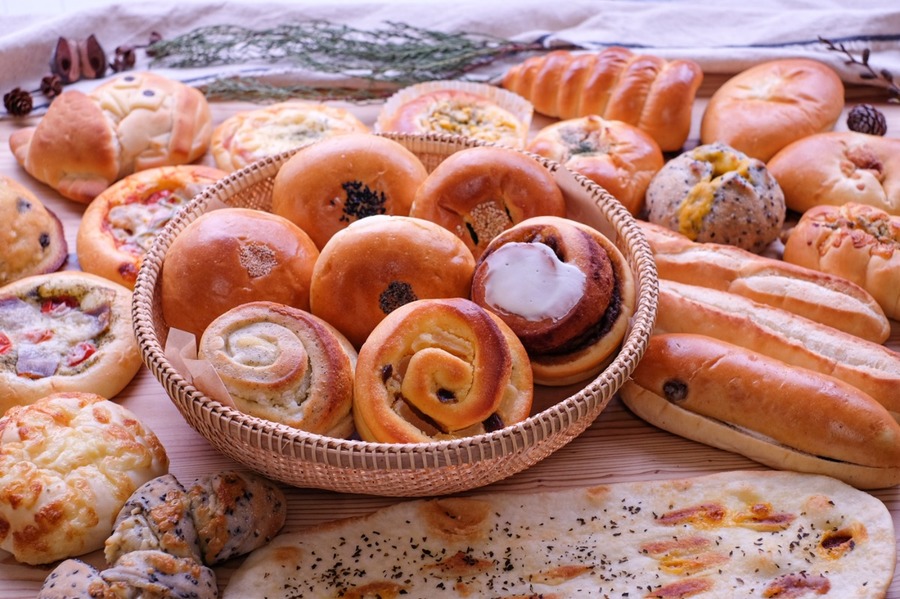 小麦粉、バター、マーガリン、牛乳、脱脂粉乳、卵、砂糖、天日塩など ※一部の材料に添加物を使用しています。予めご了承ください。 ※各パンに原材料表示シールを貼付します。