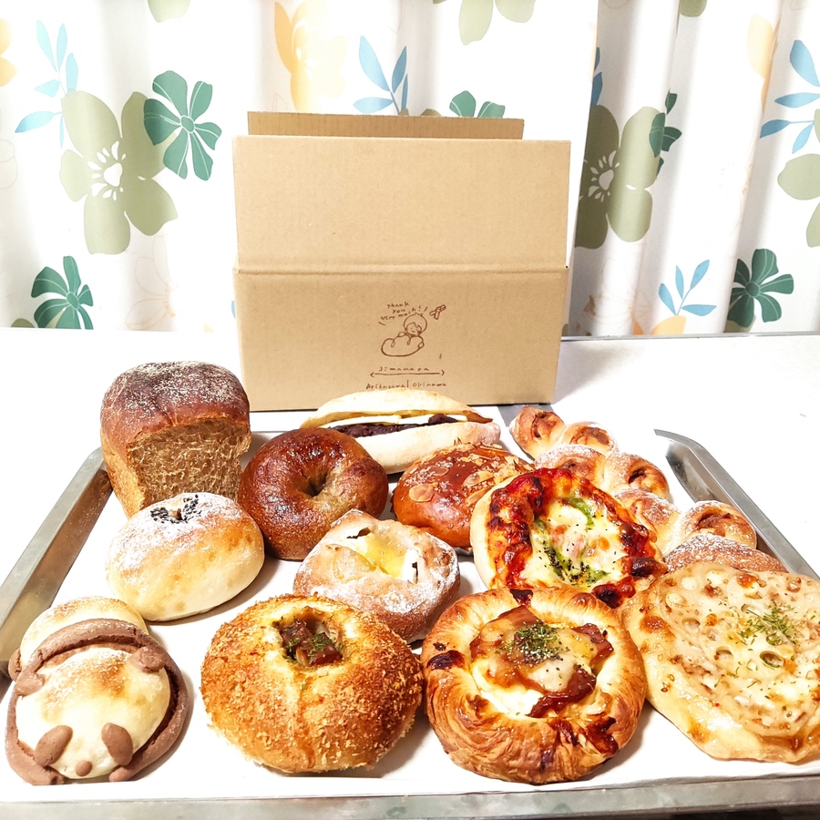 12個ほど入ります。 小ぶりではありますが、ソフトな生地からセミハードな生地までを、その日の残りパンからなるべくバランスよくお届け出来たらと思っております。 箱60サイズ:外寸縦20cm×横27cm×高さ13cm