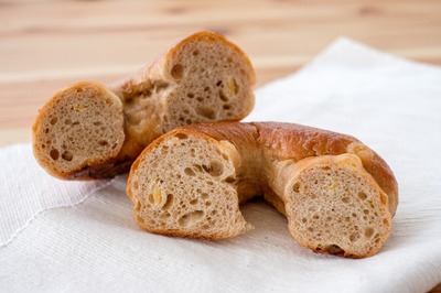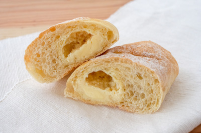 自然解凍後、あらかじめ余熱しておいたオーブンやトースターで温めてお召し上がりください。 パン全体に霧吹きなどで軽く水をかけてからトースターで3分~4分ほど加熱するとさっくり、もっちり出来たてのようになり美味しく召し上がれます。