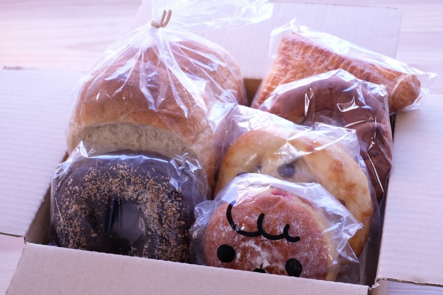 60サイズの箱に8~10個程度のパンを詰めてお届けします。 ※同じものが2つ入る事があります。
