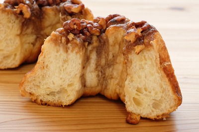 自然解凍後、あらかじめ余熱しておいたオーブンやトースターで温めてお召し上がりください。 パン全体に霧吹きなどで軽く水をかけてからトースターで3分~4分ほど加熱するとさっくり、もっちり出来たてのようになり美味しく召し上がれます。 厚みのあるパンは表面がこげやすいのでアルミホイルをかけて加熱してください。