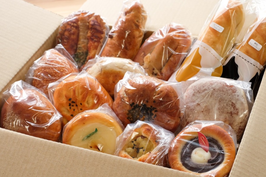 80サイズ(外寸70cm)の箱に18個以上のパンが入ります。 ※パンの大きさにより個数は変動します。 ※パンの種類はお選び頂けません。 ※同じ種類のパンが2つ入ることもございます。