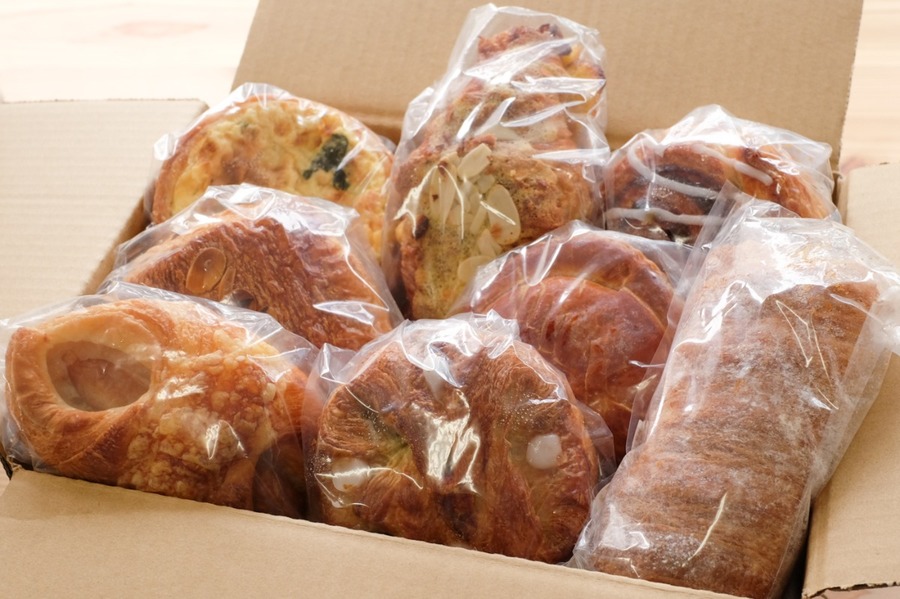 合計10個、以下のクロワッサンとデニッシュとパイが入ります。 ●クロワッサン ●アーモンドクロワッサン ●クリームホーン ●シナモンロール ●パンオショコラ ●リンゴのクイニーアマン ●ソーセージ ●ホウレン草のキッシュ ●アップルパイ ●季節で変わる期間限定デニッシュ