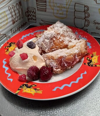 中はオレンジピールたっぷりのしっとりブリオッシュ生地かな?外はスライスアーモンドとダマンド?風味が良くて とっても美味しい。