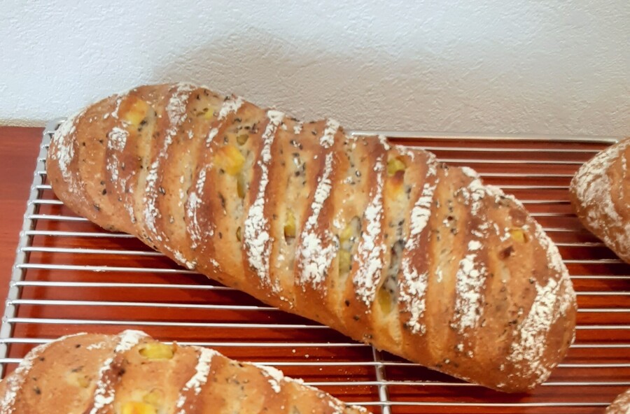自然解凍後、あらかじめ余熱しておいたオーブンやトースターで温めてお召し上がりください。 パン全体に霧吹きなどで軽く水をかけてからトースターで3分~4分ほど加熱するとさっくり、もっちり出来たてのようになり美味しく召し上がれます。