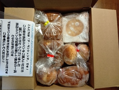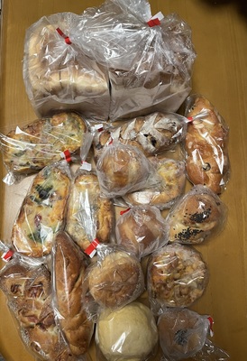 多くの種類のパンが箱いっぱい入っていました。受け取って早速頂きました