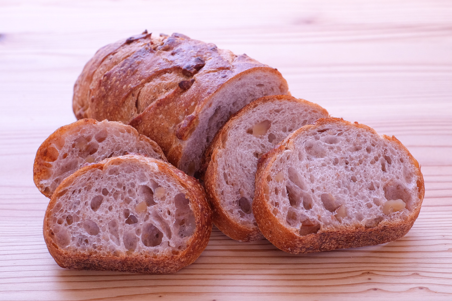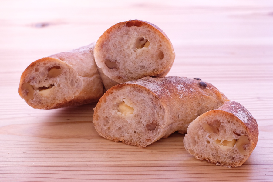 小麦粉・自家製レーズン酵母・砂糖・塩・モルト・・ホワイトチョコレート・クルミクルミ ※乳製品・卵を使った商品と同じ工房で製造しております。 アレルギーがご心配な方はお控え下さい。 ※各パンに原材料表示シールを貼付します。 くるみチーズ(商品一例):小麦粉(国内製造)、クリームチーズ、風味ペースト、くるみ、自家製酵母(レーズン、砂糖、モルト)、砂糖、塩、モルト/安定剤(加工でんぷん)、香料、酢酸Na、リン酸塩Na(一部に小麦、乳成分、クルミを含む)