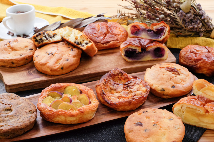 小麦粉(国内製造)、牛乳、砂糖、バター、卵、アーモンド、くるみ、ごま、さつまいも、なたね油、はちみつ、りんご、つぶあん、他 ※アレルギーがご心配な方はご遠慮下さい。 ※各パンに原材料表示シールを貼付します。