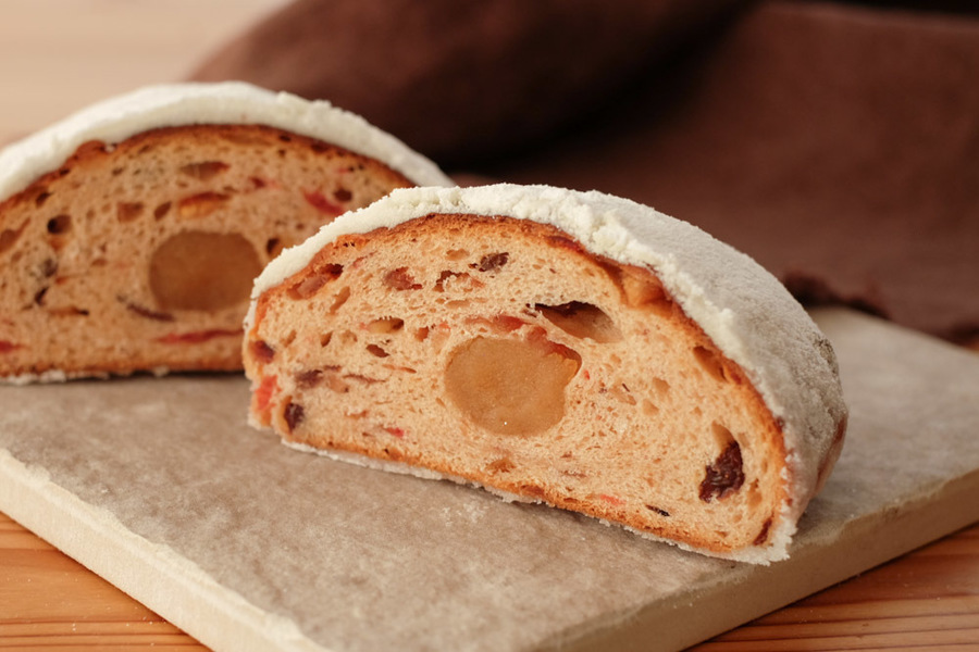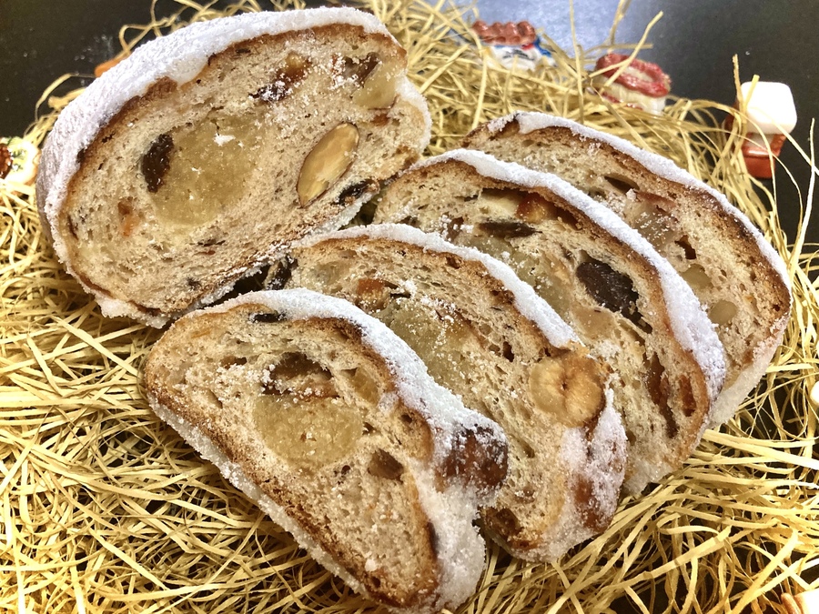 小麦粉、バター、イースト、牛乳、卵、粉糖、塩、ドライフルーツ(オレンジピール、レーズン、チェリー、パイン砂糖漬け、レモンピール、マンゴー)、ナッツ(くるみ、ヘーゼルナッツ、アーモンド)、香辛料(シナモン、ナツメグ、カルダモン)、ラム酒 ※アレルギーがご心配な方はご遠慮ください。