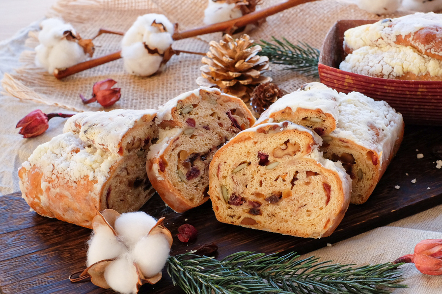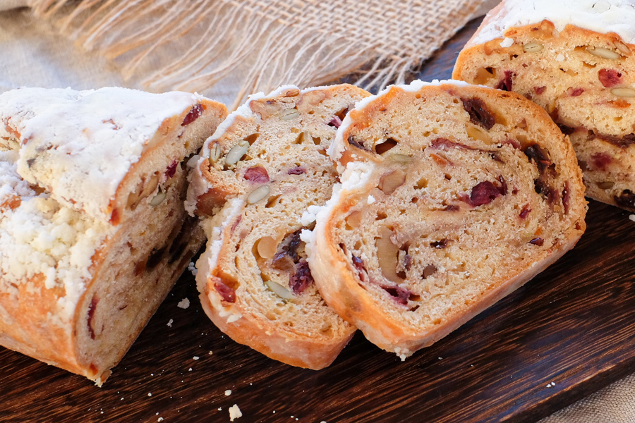 小麦粉、牛乳、バター、卵、砂糖、オレンジピール、レーズン、クランベリー、クルミ、かぼちゃの種、イースト、洋酒、香料、香辛料 アレルゲン(7品目):小麦、卵、乳成分 ※そのほかのアレルギーがご心配な方はお店までお問い合わせください。