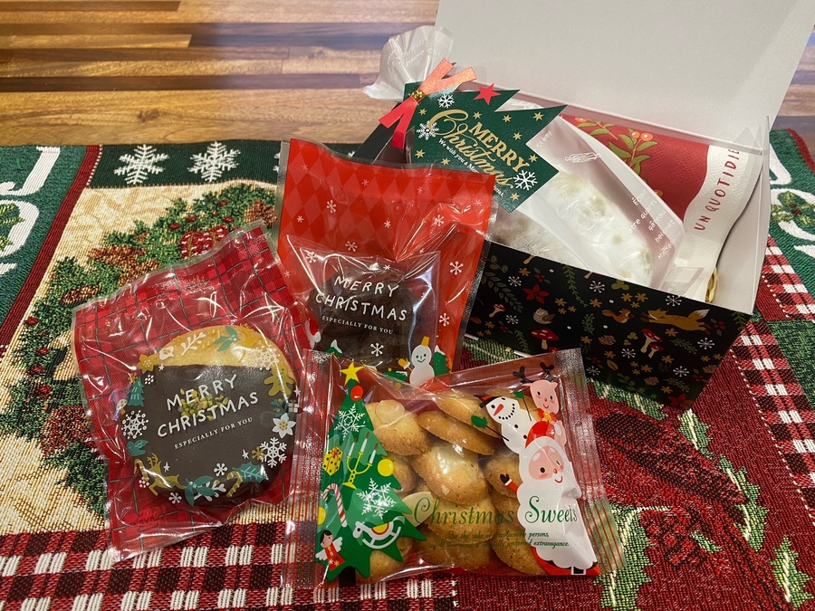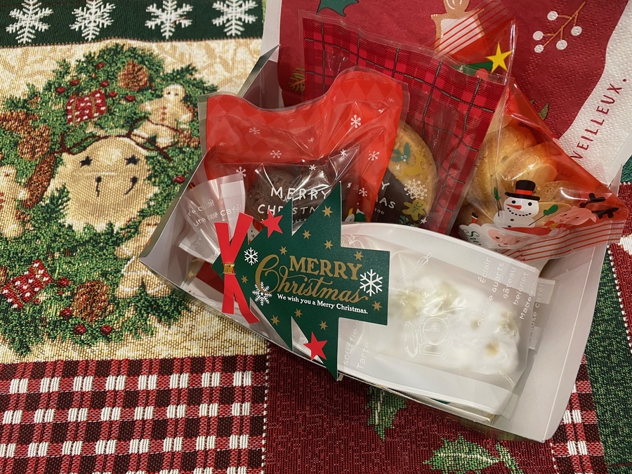 【シュトーレン】 強力粉 薄力粉 バター 牛乳 砂糖 ローマジパン 生イースト 全卵 塩 シナモン レーズン サンライズレーズン カレンズ アーモンド ドライいちじく オレンジピール ラム酒 【クッキーチョコサンド】 バター 砂糖 薄力粉 全卵 チョコレート プラリネ 【プチショコラ】 チョコレート バター 全卵 砂糖 薄力粉 【ラングドシャ】 バター 薄力粉 卵白 アーモンド ※アレルギーがご心配な方はご遠慮下さい。
