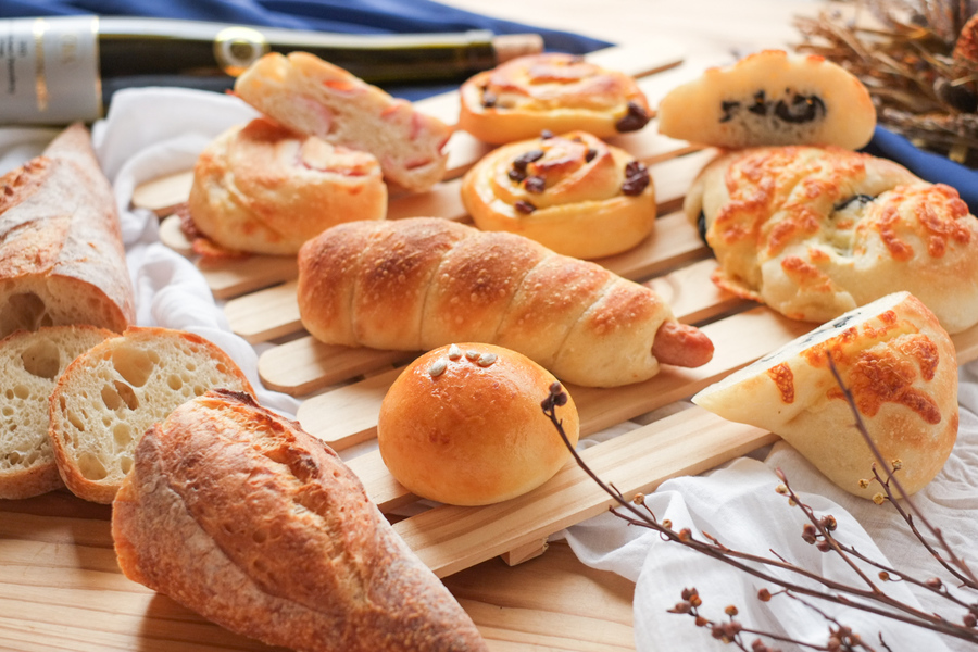 主な原材料:小麦粉、卵、バター、生クリーム、砂糖、イースト、塩、レーズン、チーズ、オリーブ、ソーセージ、ベーコン、あんこ、ほか アレルゲン:小麦・卵・乳成分・豚肉・鶏肉・大豆など ※アレルギーがご心配な方はご遠慮下さい。 ※各パンに原材料表示シールを貼付します。