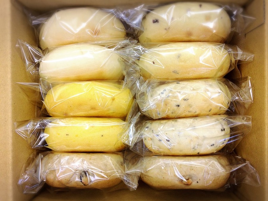 主な原材料:小麦粉、玄米粉、粗製糖、天日塩、天然酵母、(各種野菜) ※各パンに原材料表示シールを貼付します。 金ごまベーグル(商品一例):小麦粉、玄米粉、金ごま、粗製糖、天日塩、天然酵母