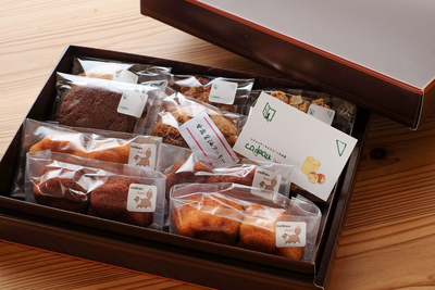7種類、合計9個のセット ●ダブルチョコクッキー ●甘露醤油クッキー ●オートミールクッキー ●チョコチップ胡桃クッキー ●アーモンドビスコッティ ●猫の手フィナンシェプレーン 2個 ●猫の手フィナンシェココア 2個