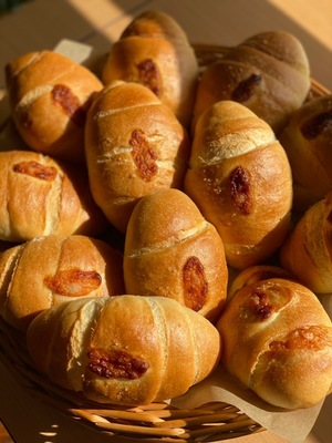 キッシュ、生食パン、小ぶりのパン15個が入ります。 ※ご希望がございましたら、生食パンなしで、その分小ぶりのパンの数を増やして箱いっぱいにしてお送りすることもできます。購入日にコメントください。