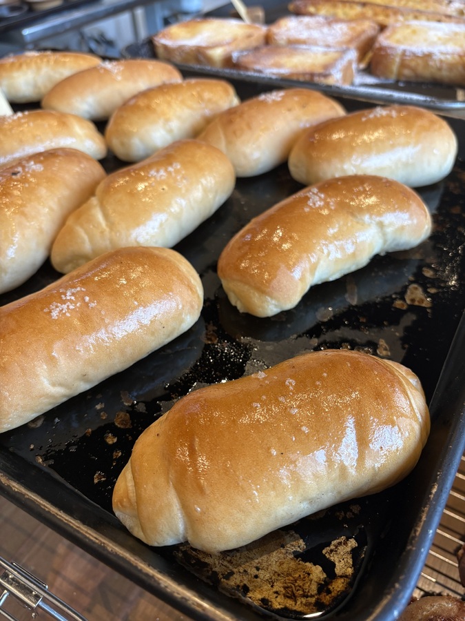 自然解凍後、あらかじめ余熱しておいたオーブンやトースターで温めてお召し上がりください。(※気温が上がってくる夏場は一晩冷蔵庫で解凍してください) パン全体に霧吹きなどで軽く水をかけてからトースターで3分~4分ほど加熱するとさっくり、もっちり出来たてのようになり美味しく召し上がれます。