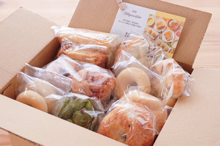 米粉パンと米粉のお菓子が入ります。 ※季節によって一部内容や個数が変わる場合がございます。 予めご了承ください。 今回掲載されている商品内容 12種20個入り 【固定商品】 ●シナモンロール 2個 ●おからスコーン:ココナッツ 2個 ●おからスコーン:メープル 2個 ●米粉焼きドーナツ 3個 ●ベーグル:プレーン 1個 ●ぶどうパン 2個 ●ココナッツパインパン 2個 ●お豆腐米粉マフィン:ココア or 抹茶 or チャイ(いずれか2種各1個) ●フォカッチャ:クミンorハーブorプレーン(いずれか1個) 【固定商品以外のお楽しみ商品】 ●ベーグル:バジルチーズ or クランベリー or ココア or 抹茶 or かぼちゃ(いずれか 1個) ●あんぱん2個入 : 小倉餡 or 抹茶&南瓜餡 or サクラ餡