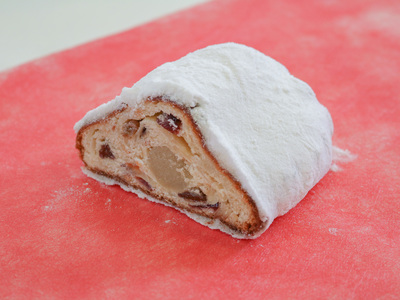 小麦粉(国内製造)、ファッドスプレット、マジパンローマッセ、牛乳、アーモンド、レーズン、オレンジピール、アーモンドプードル、上白糖、りんご、パパイヤ、コンデンスミルク、卵黄、ラム酒、キルシュ、イースト、食塩、カルダモン/トレハ(一部に小麦、卵、乳、オレンジ、大豆、りんごを含む)