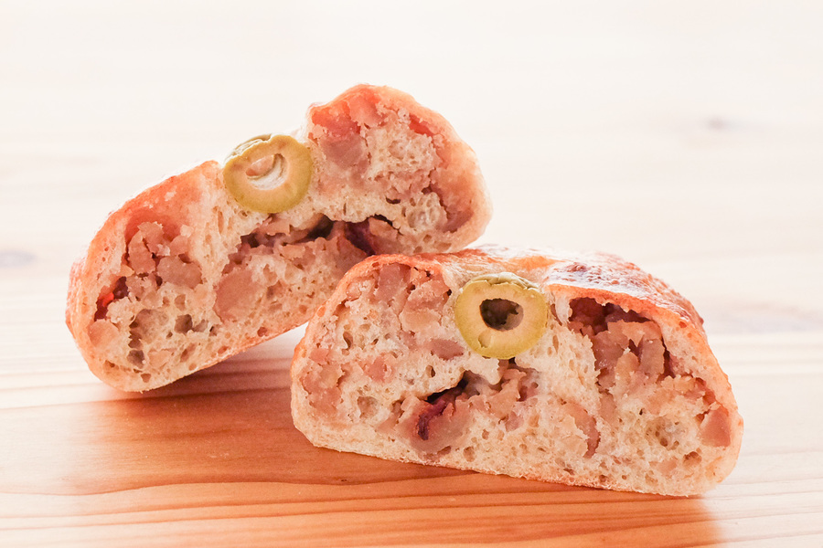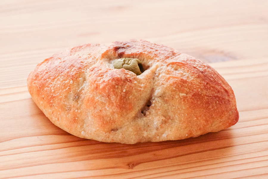 モチモチのパン生地の中に、ホクホクの栗がたっぷり入っています。マロングラッセは完全無添加で、モチモチの生地と相性ばっちり!栗の自然な甘みとパン生地の旨味が楽しめます。オリーブの塩味がアクセントになっています。