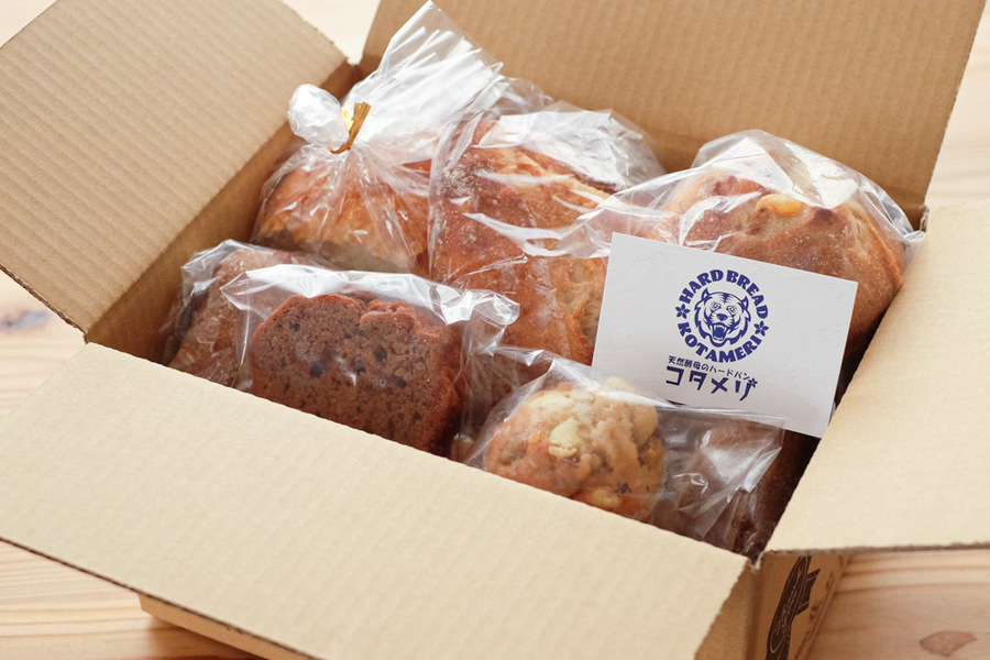 高加水食パン、ハードトースト、その他6〜7種類のパン又はケーキやスコーンが入ります。 ※パンのスライスについて 水分保持の観点から、当店ではスライスなしでお届けします。 バゲットのみ、お送りするさいはハーフカットしてお詰めします。