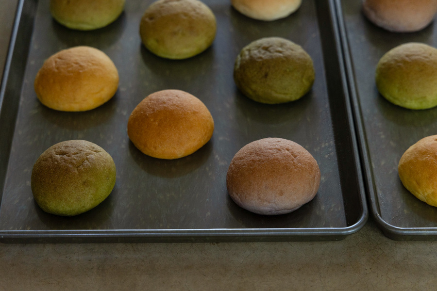 直径約7センチの丸いパン 20個 小松菜、明日葉、かぼちゃ、にんじん、むらさき芋 のアソートセットです。 ※パンの種類はお選びいただけません。