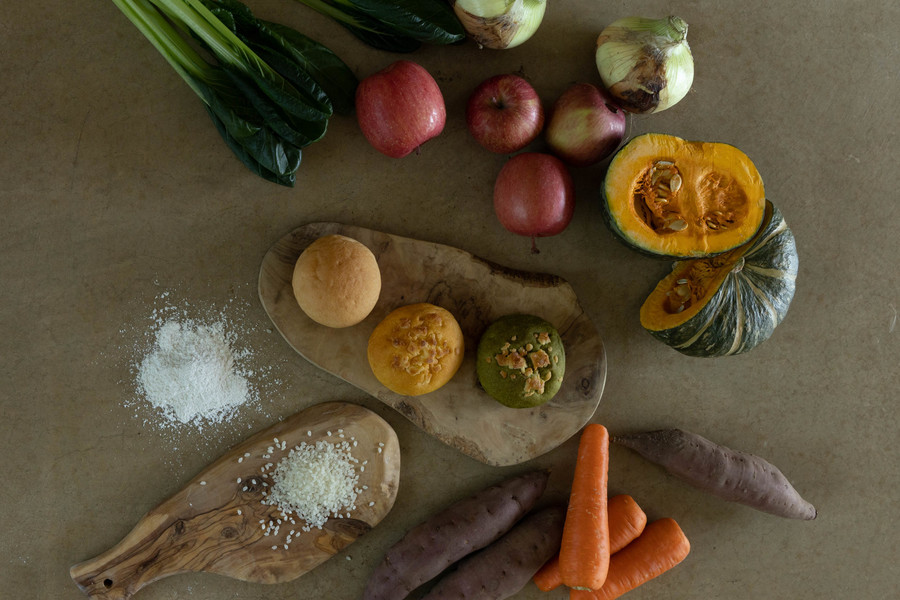 ・野菜パン/プレーン 米粉(岡山県産)、きび砂糖、こめ油、パン酵母、コーンスターチ、野菜パウダー 、塩/増粘剤(サイリウムシード)、 ベーキングパウダー(アルミフリー)、トレハロース、乳化剤(ショ糖脂肪酸エステル) ・野菜パン/豆乳チーズ 米粉(岡山県産)、きび砂糖、こめ油、パン酵母、コーンスターチ、野菜パウダー、豆乳加工食品、 塩/増粘剤(サイリウムハスク)、ベーキングパウダー(アルミフリー)、トレハロース、乳化剤(ショ糖脂肪酸エステル)、加工でんぷん、セルロース、pH調整剤、香料(一部に 大豆を含む) ※同厨房内で卵、乳、落花生、大豆、ごま、ナッツ類、ゼラチン、バナナ、牛肉、豚肉を含む製品を製造しています。 ※各パンに原材料表示シールを貼付します。