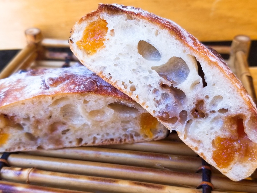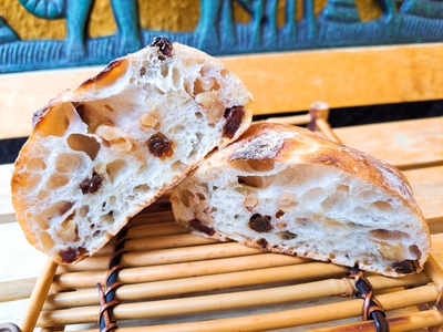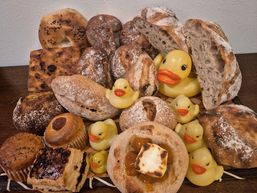 リュスティック生地:北海道産小麦粉(E65)、ホシノ天然酵母ルヴァン種、沖縄県産きび糖、シチリア産海塩 高加水フランス生地:北海道産小麦粉(ゆめちから)、沖縄県産きび糖、シチリア海塩、イースト 高加水カンパーニュ生地:北海道産小麦(ゆめちから、キタノカオリ全粒粉)、ライ麦、シチリア海塩、イースト 具材として:ドライフルーツ(いちじく・アプリコット・レーズン・マンゴー・パイナップル・クランベリー・カシス・ブルーベリー・デーツ・ココナッツなど)、季節のフルーツのジャムやコンポート、ナッツ類、クリームチーズ、あんこ、カカオニブ、チョコレート、ホワイトチョコレート、柑橘ピール、コーヒー、茶葉 など ※アレルギーがご心配な方はご遠慮下さい。