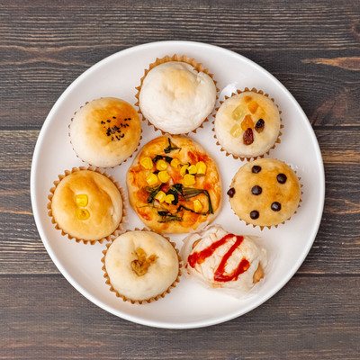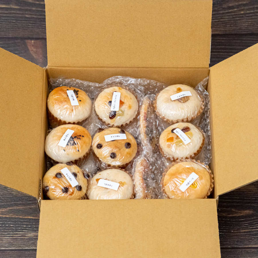 9種、各2個ずつ18個の米粉パンが入ります。 ・真っ白まるぱん ・胡桃ぱん ・ドライフルーツぱん ・チョコぱん ・コーンぱん ・つぶあんぱん ・ソーセージぱん ・ぷちピザぱん ・ポテサラぱん