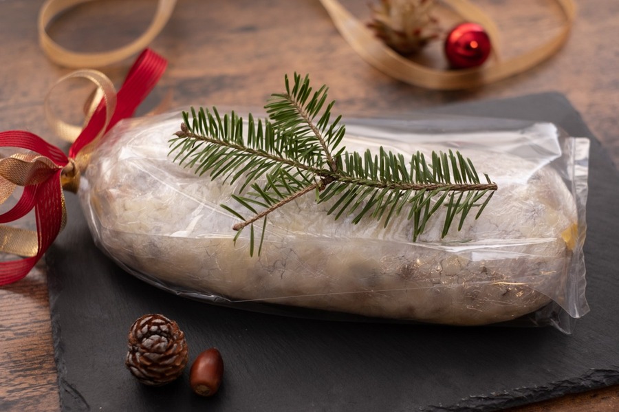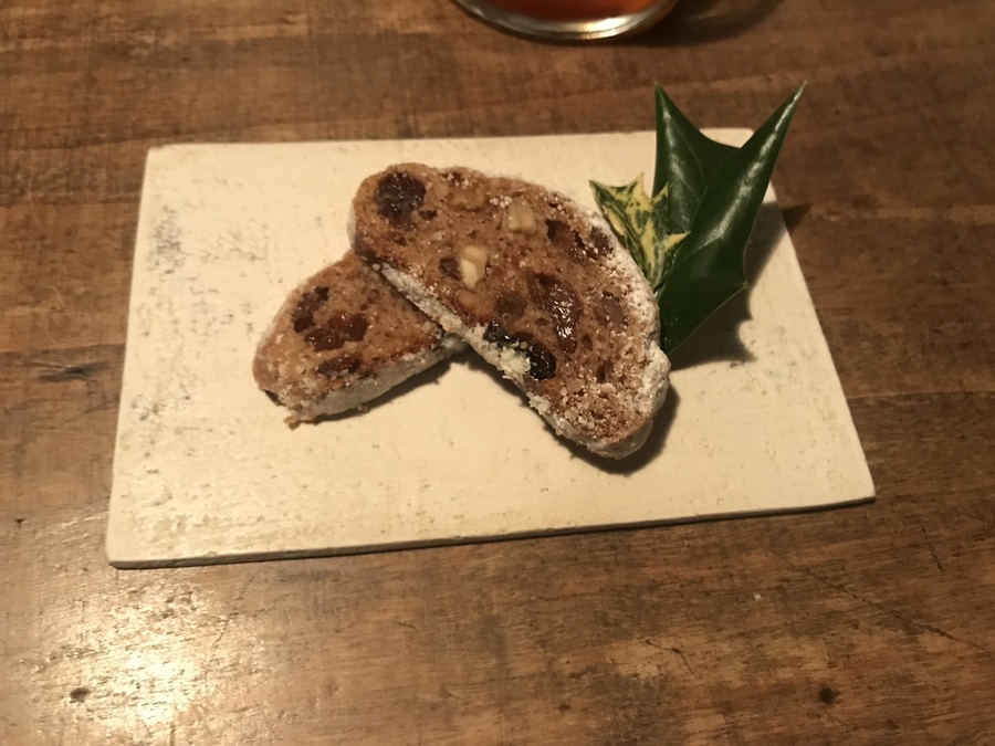 小麦強力粉(北海道産”春よ恋”)、小麦全粒粉(北海道産”ゆめちから”)、有機サルタナレーズン、バター、サワークリーム、有機クルミ、有機アーモンド、有機オレンジピール、有機レモンピール、はちみつ、砂糖、ラム酒、生イースト、塩、シナモン、ナツメグ、カルダモン