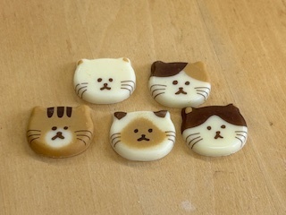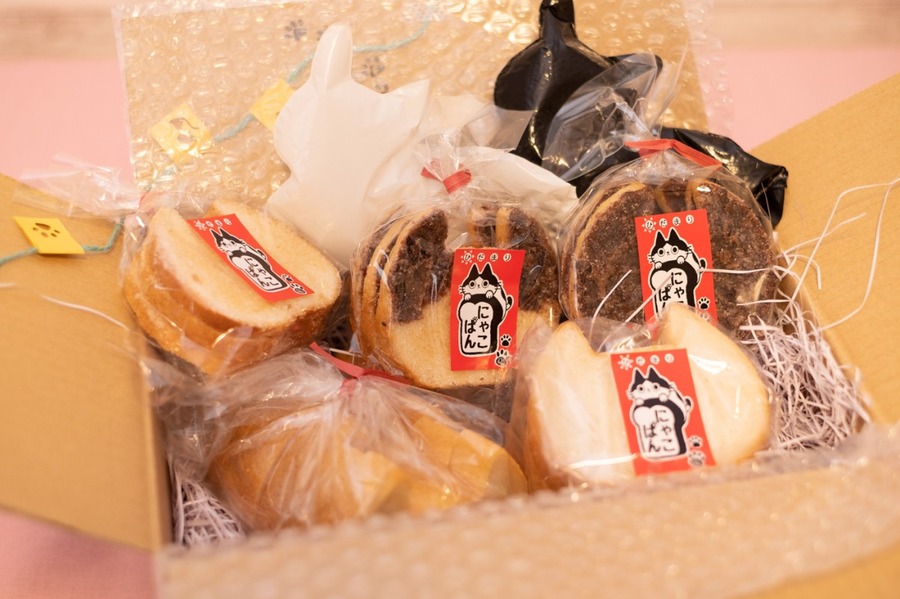 ●猫の顔型の食パン(にゃこぱん)5枚入り×2袋 (2cmスライス、約8cm×8.5cm) ●にゃこぱんラスク3種類(各3枚入り) ●にゃこぱんポストカード ●にゃこクルトン ●にゃこチョコ