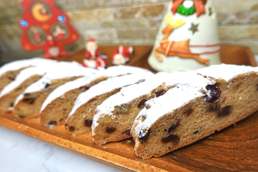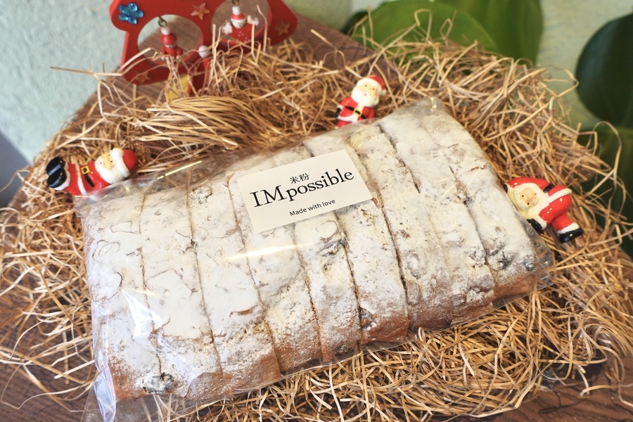原材料:米粉(国産)、ラム酒漬けレーズン、くるみ、クランベリー、甜菜糖、オリーブオイル、アーモンドプードル、シナモンパウダー、オオバコ、イースト、塩 アレルゲン:くるみ、アーモンド