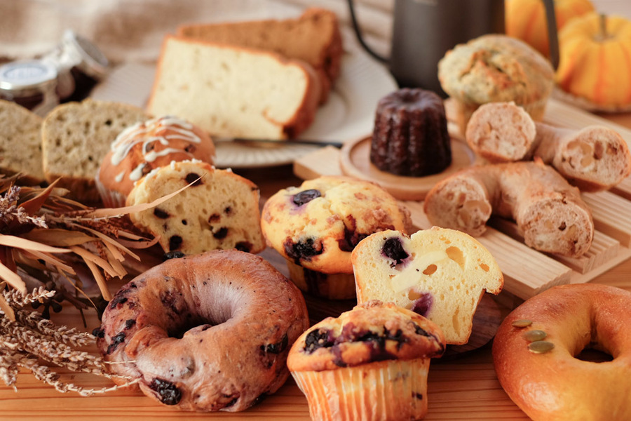 主な原材料:小麦粉、バター入りマーガリン、砂糖、牛乳、卵、食塩、イースト、はちみつ、食用ごま油 他 アレルゲン(8品目):小麦・卵・乳成分・くるみ・ピーナッツ ブルーベリークリームチーズマフィン(商品一例):小麦粉、バター入りマーガリン、グラニュー糖、牛乳、乳製品、ブルーベリー、卵、プロセスチーズ、食塩、シナモン/トレハロース、膨張剤、安定剤(増粘多糖類)、乳化剤、酒精 ※アレルギーがご心配な方はご遠慮下さい。 ※各パンに原材料表示シールを貼付します。 ※一部はちみつを使用したパンや焼菓子が入ります。