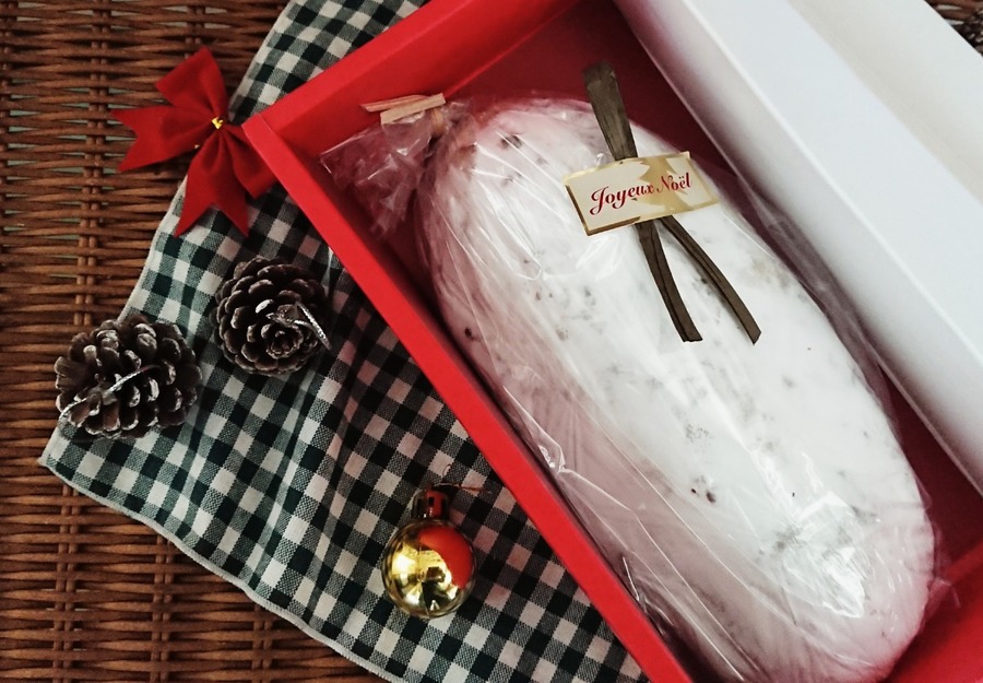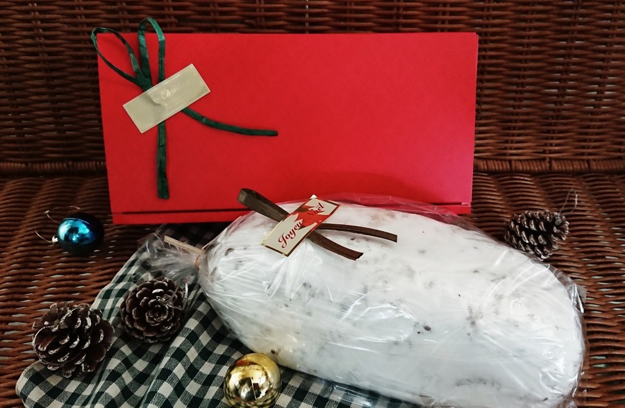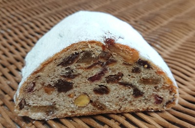 【かいほのかのシュトレン】 山梨県内産小麦(かいほのか)・全粒粉・牛乳・バター・グラニュー糖・卵・塩・パン酵母・粉糖 レーズン・オレンジピール・レモンピール・クランベリー・フィグ・クルミ・アーモンド・ラム酒・赤ワイン・カルダモン・グローブ (小麦・卵・乳製品・くるみを含みます)