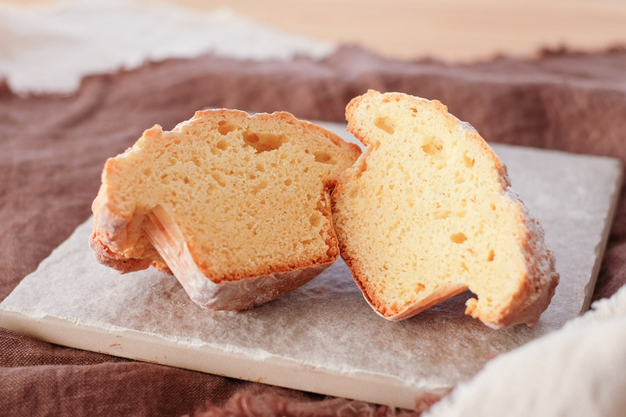 自然解凍後、電子レンジで20~30秒ほど温めてください。 その後、予熱しておいたオーブンやトースターで1~2分温めてお召し上がりください。