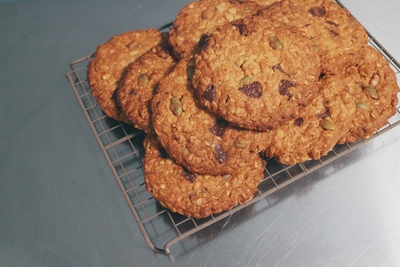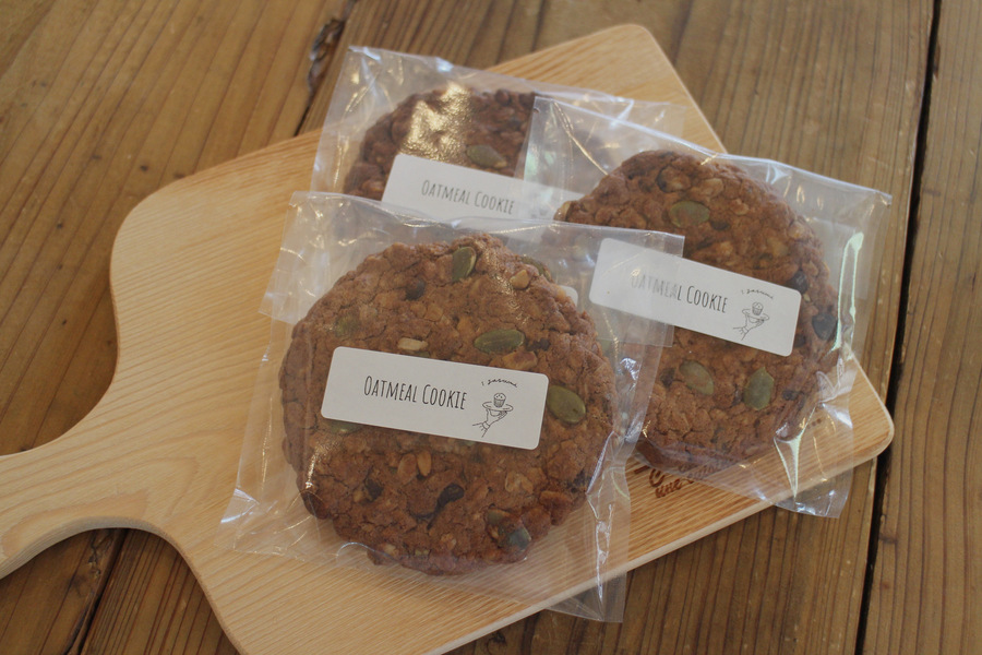 原材料:有機オーツ麦(イギリス製造)、きび砂糖、菜種油、小麦粉、アーモンドプードル、チョコレート、くるみ、牛乳、かぼちゃの種、ゲランドの塩、/膨張剤、乳化剤(大豆由来)、香料、(一部に小麦・乳成分・くるみ・大豆を含む)