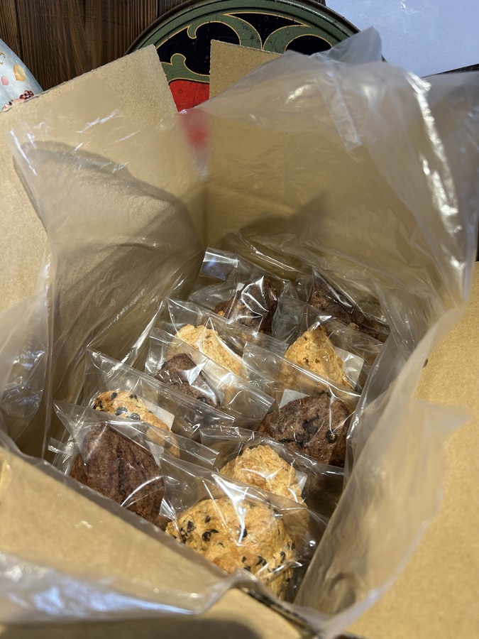 小麦粉(国内製造)、加工油脂、砂糖、バター、牛乳、生クリーム、卵、ショートニング、、食塩、/ベーキングパウダー、香料、乳化剤、その他 ※アレルギーがご心配な方はご遠慮下さい。 ※各袋に原材料表示シールを貼付します。